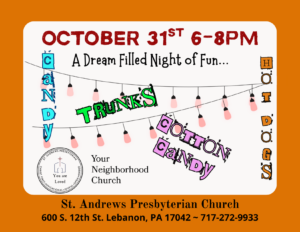 St. Andrews youth ministry will host Trunk or Treat in the parking lot of St. Andrews Presbyterian Church, 600 S. 12th St. Lebanon PA! We will have decorated cars and costumed friends handing out candy. Joining the fun of Trunk or Treat provides for lasting memories and the joys of family time with half the stress.